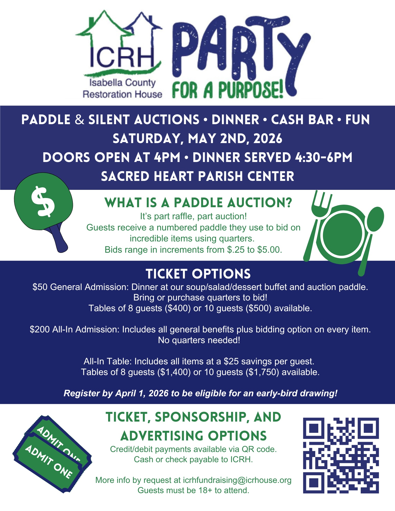 ICRH Party for a Purpose is our annual fundraising event to benefit the local homeless shelter. It is scheduled for May 2, 2026. We utilize a paddle auction which is part raffle and auction, a fast-paced evening that gets many attendees vying for items. Guests bring their rolls of quarters and use them to bid on items in the auction OR they pay for an "All-In" paddle, which gives them automatic bidding for each item in the auction. Tickets must be purchased in advance as we expect this to be a sell-out event of 325. Tickets: $50 each or $400 for table of 8 or $500 for a table of 10. Includes: delicious buffet of soups & salad dinner, dessert, and auction paddle.*Guests must be 18 yrs. or older to attend. Bring rolls of quarters to bid on items of interest! OR purchase an $200 All-In Ticket which includes dinner, plus bidding on every item! (No quarters needed for an all-in-ticket.) You may also buy an All-In Table! ($25 savings per person) which Includes dinner, 8 ($1,400) or 10 ($1,750) person table.